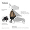 - The stroller stays ultra-maneuverable, retains one-handed steering, and has a rolling base to support the bag’s weight