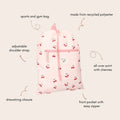 Get inspired by this awesome, durable gym bag by Kidzroom from the Secret Garden collection. This pink gym bag is an ideal item to take to gym or swimming lessons. It has a pink colour and features an all-over print with red cherries. The bag has a drawstring closure and adjustable shoulder straps. The bag also has a super handy front zip pocket for small items such as keys, rubber bands or a wallet. Furthermore, this gym bag is made of 100% recycled polyester. This also makes this fun item very sustainable. With the adjustable shoulder straps, this bag can be customized for everyone. So even the smallest children can enjoy a super cool gym bag.