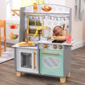 Blending imagination and play, the KidKraft Smoothie Fun Play Kitchen takes a healthy approach to role playing. A refreshing color scheme with golden accents mixes in nicely with your homes decor. Kids will love tossing in all the pretend fruit and veggies, pouring in some juice and pressing the button on the blender to see and hear it all spin around. And of course, theres the usual playing and learning of clickable knobs, opening doors and moveable faucet handle to keep little ones' hands busy. With everything included to whip up healthy smoothies, kids can chop, blend, and pour fruity drinks for themselves and friends any time