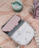 Insulated lunch bag in powder pink with Ozzo design, perfect for keeping snacks fresh.