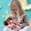 Lea is a beautiful red-haired baby doll, dressed in a lovely dress and jacket set. She has a soft fabric body and vinyl limbs.