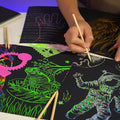 Gently Scratch the black surface to reveal amazing, bright patterns underneath. Create colourful pictures, incredible decorations or unique greeting cards. Superb for school projects, presentations and messages.