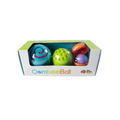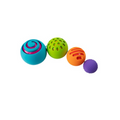 Each colorful ball is uniquely textured with fascinating dots, lines, and swirls. Meanwhile, short, safe tethers keep them all connected in a wonderfully wobbly row.