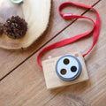 - Wooden camera with 3 colored lenses: clear, yellow, and blue
