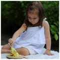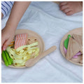 The set includes pasta, 1 piece of salmon, 3 asparagus sticks, 2 lemon slices, 2 mushrooms, 1 fork, 1 spoon, and a plate. Made from sustainable rubber wood, it is safe, durable, and eco-friendly.