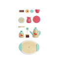 - PLENTY OF PIECES: The playset contains a wooden tray, a lidded teapot, two teacups and saucers, a sugar bowl and creamer, a tea bag, three desserts with a plate.